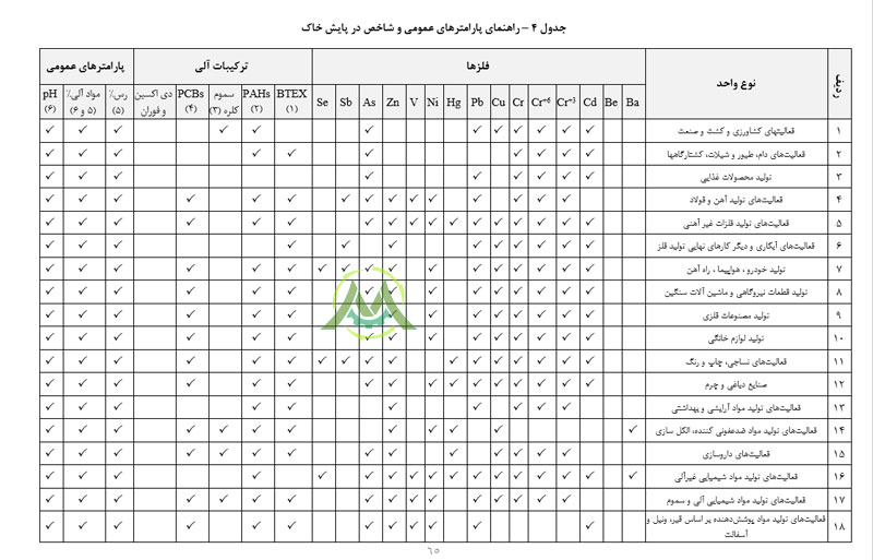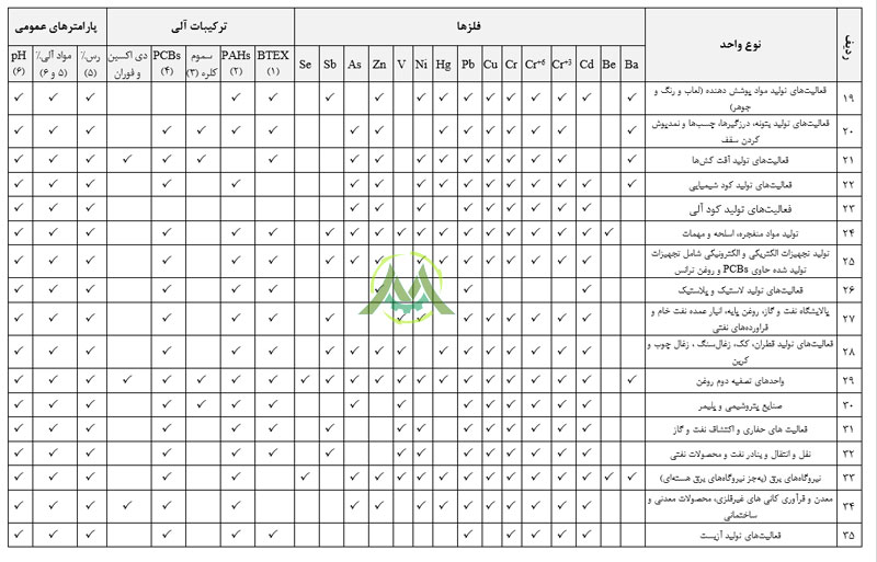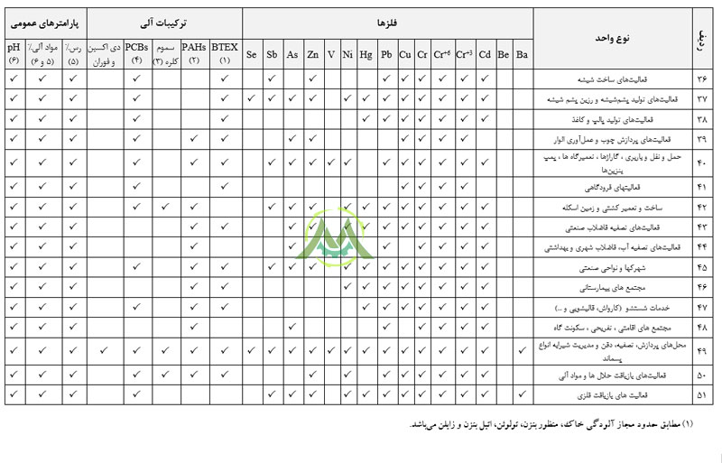 (۲) ترکیبات PAH مطابق حدود مجاز آلودگی خاک و شاملNaphthalene, Acenaphthylene, Acenaphthene, Fluorene, Phenanthrene, Pyrene, Anthracene, Fluoranthene, Benzo (a) Pyrene, Benzo (b) Fluoranthene, Benzo (k) Fluoranthene, Benz (a) Anthracene, Dibenz (a, h) Anthracene, Chrysene, Benzo (g, h, i) perylene, Indeno[1,2,3-cd]pyrene می‌باشد. انتخاب پارامترها بر حسب فرایند تولید، مواد اولیه و واسطه و یا پیشنهاد اداره کل صورت پذیرد.