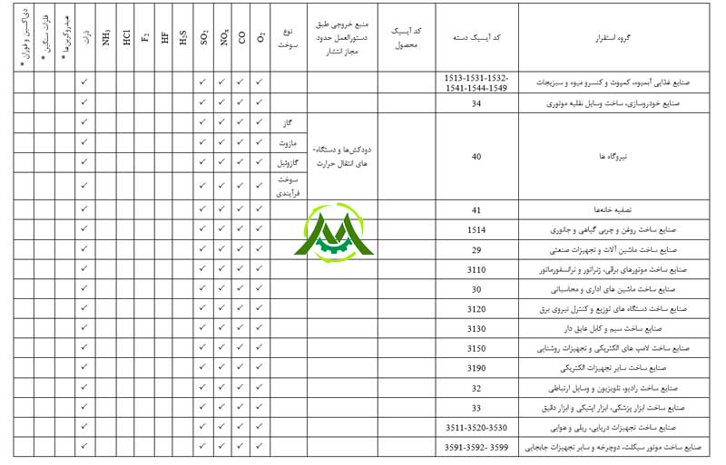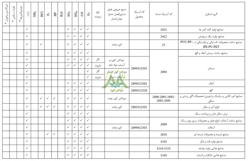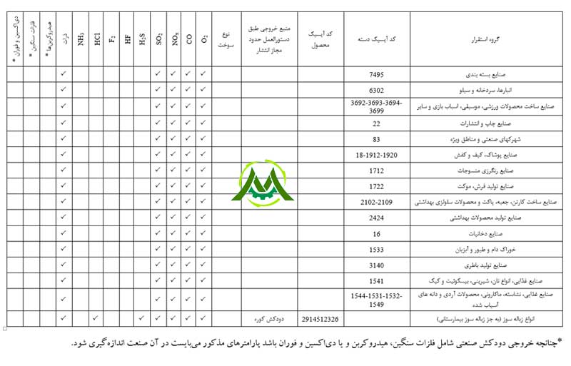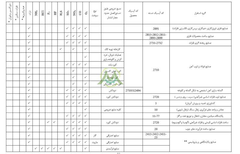 تبصره ۱: فلزات سنگین خروجی از دودکش شامل پارامترهای Hg، Pb، Cr، Cd، As، Ni، Se، Co، Te، Zn، Cu، Sb، Mn، V، Sn، Ba، Be می‌باشد.